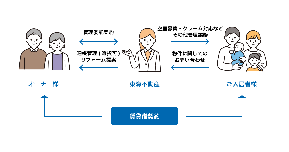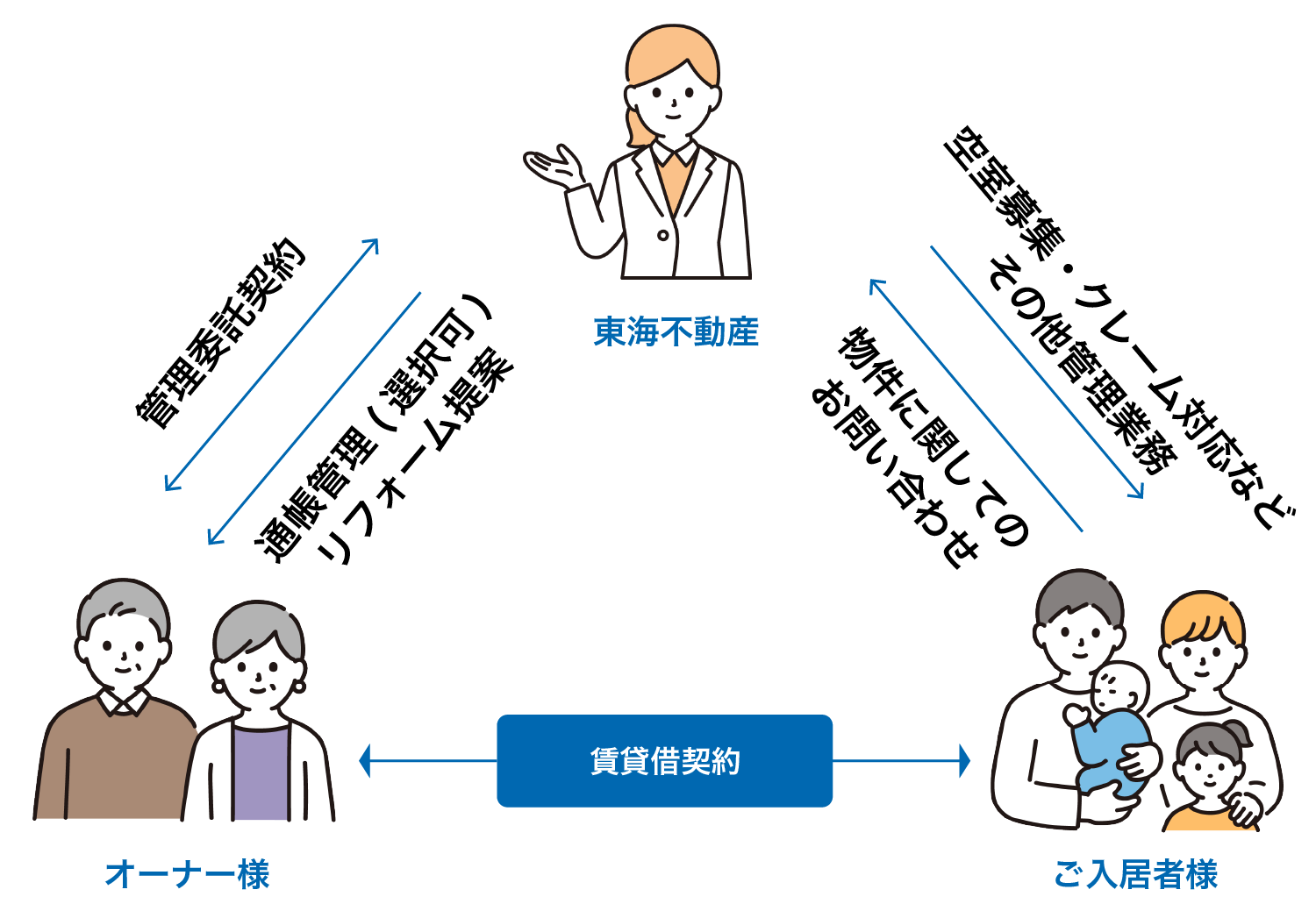 東海不動産がオーナー様の代行として、全ての窓口業務を行います。